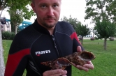 Po kilkukrotnych odwiedzinach Grecji i zebraniu na miejscu okazałego zbioru przedstawicieli lokalnej malakofauny morskiej, zapragnąłem wreszcie odwiedzić pobliski Cypr. Skłoniły mnie do tego relacje innych kolekcjonerów, według których pozostało tam jeszcze ciągle wiele miejsc gdzie można znaleźć sporo endemicznych dla Morza Śródziemnego okazów muszli. W tym zwłaszcza moich ukochanych śródziemnomorskich porcelanek. Pamiętałem przy tym, że relacje optymistyczne przeplatały się z pesymistycznymi, które dotyczyły postępującej dewastacji cypryjskiego wybrzeża (rozrost infrastruktury hotelowej bezpośrednio na wybrzeżu, zanieczyszczenie i zmętnienie lokalnych wód, etc.). Niestety w ciągu dwóch tygodni pobytu Cyprze mogłem się osobiście przekonać, że na miejscu sytuacja nie wygląda już tak różowo. Bazą wypadową stał się dla mnie hotel usytuowany w malowniczej zatoce Coral Bay w dystrykcie Pafos na zachodnim wybrzeżu wyspy. Miejsce to – kilkadziesiąt lat temu – słynęło z połowu gąbek i korali szlachetnych. Dziś już ich tam nie ma. Jest za to miejsce pełne zgiełku i często ze zmąconą wodą (wysokie fale, prądy, ect.), w której poszukiwanie muszli było zajęciem trudnym. Zatoka Coral Bay (poza kilkoma niewielkimi przedstawicielami endemicznego małża Pinna nobilis, a także Spondylus gaederopus oraz dość pospolicie występujących ślimaków z gatunku np. Hexaplex trunculus), była przygnębiającym świadectwem destrukcji powodowanej nadmiernym rozrostem infrastruktury hotelowej, masową turystyką, etc. Jakże chciałbym móc przenieść się w czasie i nurkować w Coral Bay choćby pół wieku temu! Niestety. Musiałem szukać okazów do zbioru w takich warunkach jakie zastałem na miejscu. Nie poddałem się. Skoro w obszernej zatoce nie znalazłem niczego godnego uwagi, postanowiłem ruszyć skalistym, klifowym wybrzeżem na północ. Po przejściu dość niebezpiecznym nabrzeżem około dwóch kilometrów wchodziłem do wody. I moim oczom ukazywał się inny świat. Woda była krystalicznie czysta, a wybrzeże pozbawione turystów. Z reguły pływałem wzdłuż skalistego wybrzeża około dwóch kilometrów zatrzymując się po drodze wielokrotnie jak tylko zobaczyłem na dnie cokolwiek godnego uwagi. Nurkowałem zawsze na wstrzymanym oddechu, bez akwalungu – wyposażony jedynie w dobrą maskę, fajkę, płetwy, nóż nurkowy i neoprenowy skafander. Po krótkim treningu swobodnie udawało mi się schodzić na głębokość około 7 – 8 metrów. Warto było zaryzykować. Podczas dwutygodniowego pobytu i codziennej penetracji wybrzeża napotkałem aż siedem żywych egzemplarzy majestatycznego ślimaka Charonia tritonis variegata. Najlepszej jakości muszle zachowałem w kolekcji, a te gorsze pozostawiałem w morzu wraz z lokatorami. Zbieranie na oślep i zabieranie z morza więcej muszli niż potrzebujemy jest niewłaściwe i nieetyczne. Trytony najczęściej chowały się w szczelinach między skałami, w godzinach popołudniowych gdy słońce kończyło już operować natknąłem się na dwa egzemplarze wędrujące beztrosko po kamiennym dnie. Jednego zaś w trakcie konsumpcji jeżowca. Inny miał najpiękniejszą muszlę (bardzo ciemną i doskonałą) jaką kiedykolwiek wcześniej widziałem. Prawdziwe cudo wielkości 184 mm. Skorupy niemal nie trzeba było czyścić z zewnątrz. Szkoda, że większość Charonia tritonis variegata ma muszle dość mocno zerodowane z utrąconą wargą lub wierzchołkiem. Najpiękniejszą sztukę złowiłem na głębokości raptem dwóch metrów! Mogę tylko żałować, że nie miałem przy sobie aparatu do zdjęć podwodnych. Mam jednak nadzieję, że załączone do artykułu fotografie, które wykonałem poza wodą zrekompensują te niedostatki. Zapraszam do galerii! W płytkiej, przezroczystej wodzie (czasem tuż przy samym brzegu, na skalnych półkach i w szczelinach między nimi), aż roiło się od trąbików Buccinum corneum i okazałych stożków Conus ventricosus. Duże i ładnie ubarwione muszle stożków były dla mnie miłą niespodzianką. Największym zaś rozczarowaniem całkowity brak porcelanek Cypraea spurca i Cypraea lurida. Na Cyprze nie widziałem ani pustych muszli, ani żywych egzemplarzy przedstawicieli cypraeidae. Byłem przygnębiony. Na otarcie łez kupiłem sobie około 30-stu ładnych egzemplarzy Cypraea spurca, bezpośrednio w domu u mojego dobrego znajomego (freedivera i nurka) Panikosa Constantinou, który zaprosił mnie do siebie do pięknego Limassol – 80 kilometrów na wschód od Coral Bay. Jesteśmy z Panikosem widoczni na jednym z załączonych zdjęć na tle gabloty z jego imponującą kolekcją muszli i koralowców. Porcelanki, które kupiłem były to egzemplarze, które łowił wiele lat temu, na szczęście niepozbawione świeżego połysku i urody. Jedna z nich wyjątkowo piękna i wielka o długości 35 mm. Wcześniej kupowałem już przepiękne i gigantyczne Cypraea spurca i Cypraea lurida od Panikosa. Wówczas muszle od niego przychodziły do mnie pocztą, na Cyprze miałem wreszcie wspaniałą okazję swojego dostawcę poznać osobiście. Z racji na stan zdrowia mój przyjaciel z Cypru już od kilku lat nie nurkuje … ale wspominał mi, że z roku na rok łowił coraz mniej egzemplarzy śródziemnomorskich porcelanek i coraz mniejszych rozmiarów. Podczas snurkowania w rejonie Limassol, pod wodą nie znalazłem żadnej ciekawej muszli. Panikos ze smutkiem przekazał mi wiadomość, że miejsce w pobliżu Limassol, gdzie od młodości wyławiał porcelanki … kilkanaście lat temu zniszczyła infrastruktura hotelowa. Ludzie bezpowrotnie zniszczyli siedlisko Cypraea spurca i Cypraea lurida. Na Cyprze nikt sobie tym jednak nie zawraca głowy. Takie odniosłem wrażenie. Kwestia przełowienia nie ma tu nic do rzeczy. Porcelanek w Morzu Śródziemnym nie łowiło się nigdy w celach komercyjnych, także kolekcjonerzy im nie zagrażają